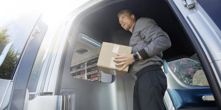 Mit Lichtanzeigen an Heck und Front warnt der Vision Van andere Verkehrsteilnehmer wie Autofahrer und Radfahrer, wenn das Fahrzeug anhält oder der Zusteller aussteigt. Auch wenn eine Drohne abhebt, warnen die Lichter.