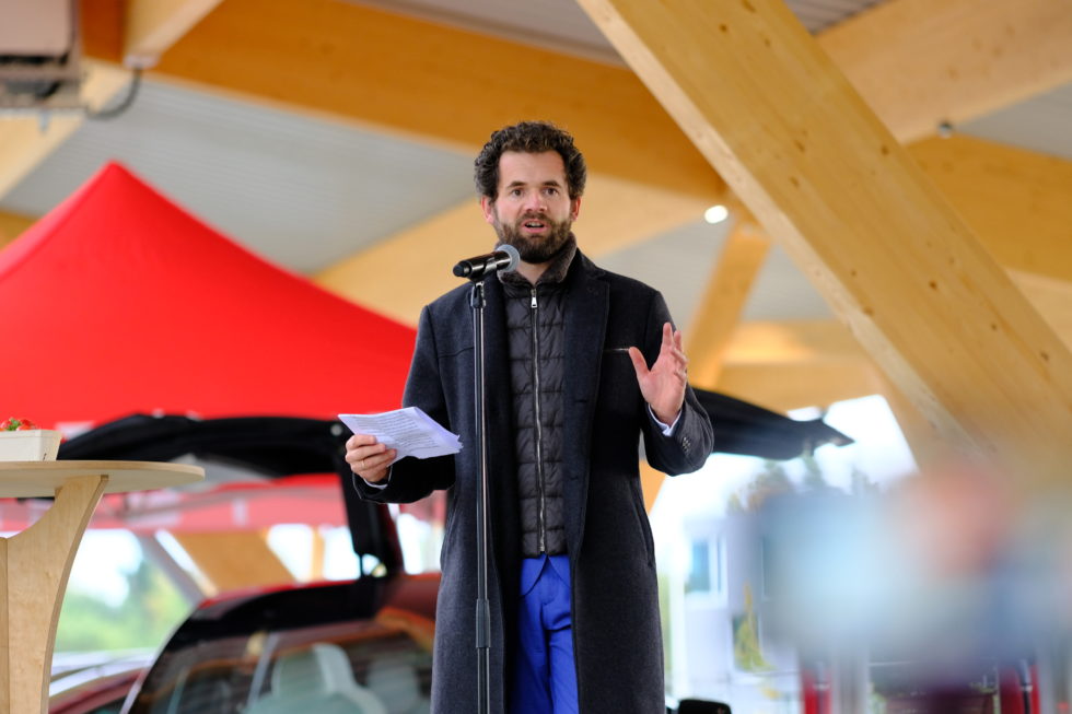 Fastned-CEO Michiel Langezaal ist aus Amsterdam angereist, um bei der Eröffnung des Schnellladeparks dabei zu sein. Seine Ladestation erläutert er an einem neuen VW id.3. Mit bis zu 300 Kilowatt fließt Strom von den Ladern in die E-Autos. Zwar kann noch kein Auto so viel nutzen, aber Langezaal denkt an Morgen.