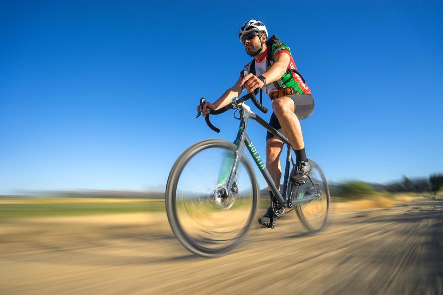 Das Cyclotron Bike ohne Speichen zeigt mit Laser: Abstand halten