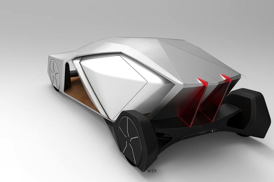 Die rautenförmige Form des Prototyps bezieht sich auf die japanische Kunst des Papierfaltens. Daher auch der Name Shiwa. Das ist Japanisch und bedeutet Falte. Außen besteht das Auto aus gebogenen Aluminiumplatten. Es ist 4,70 m lang, 2 m breit und 1,5 m hoch. Angetrieben wird dieses Zukunftsauto von vier Elektromotoren in den vier Rädern.