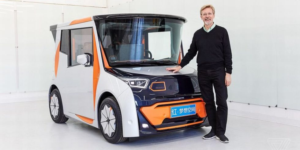 Ungewöhnlich hohe Form, seltsame Frontscheibe, Schiebetüren und ganz gerade Flanken: Der Reds von Designer Chris Bangle und dem chinesischen Fahrzeugbauer CHTC sieht erstmal seltsam aus. Der Grund: Das Design des Wagens wurde von innen nach außen gedacht.