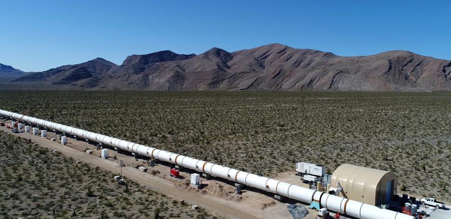 Sie ist fertig: die erste Teststrecke von Hyperloop One. Mitten in der Wüste Nevadas, umgeben von Bergen und Stoppelgras, steht die 500 m lange weiße Röhre. Künftig wollen Ingenieure hier Passagierkapseln für den Überschallzug testen.