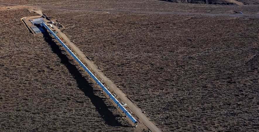 Auf den ersten Blick sieht die Teststrecke unscheinbar aus – fast wie eine herkömmliche Öl- oder Gasleitung: auf einem 500 m langen Betonfundament stehen in regelmäßigen Abständen Stützpfeiler, auf denen die 3,3 m breite Röhre ruht.