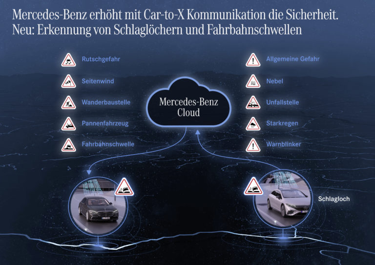 Neue Modelle der C- und S-Klasse sowie der EQS1 können demnach Schlaglöcher oder Fahrbahnschwellen erkennen. Wenn das Fahrwerks-Steuergerät ein solches Hindernis erkennt, wird es bei aktiviertem „Car-to-X Kommunikation“-Dienst samt Positionsdaten über das Mobilfunknetz in Echtzeit in die Mercedes-Benz-Cloud gesendet. Andere Fahrzeuge von Mercedes-Benz in der Nähe werden dann sofort informiert und die potenziell gefährlichen Ereignisse mit Icons auf der Navigationskarte angezeigt. Etwa zehn Sekunden, bevor der Fahrer die relevante Stelle erreicht, ertönt eine akustische Warnung und das Icon wird optisch noch einmal hervorgehoben.