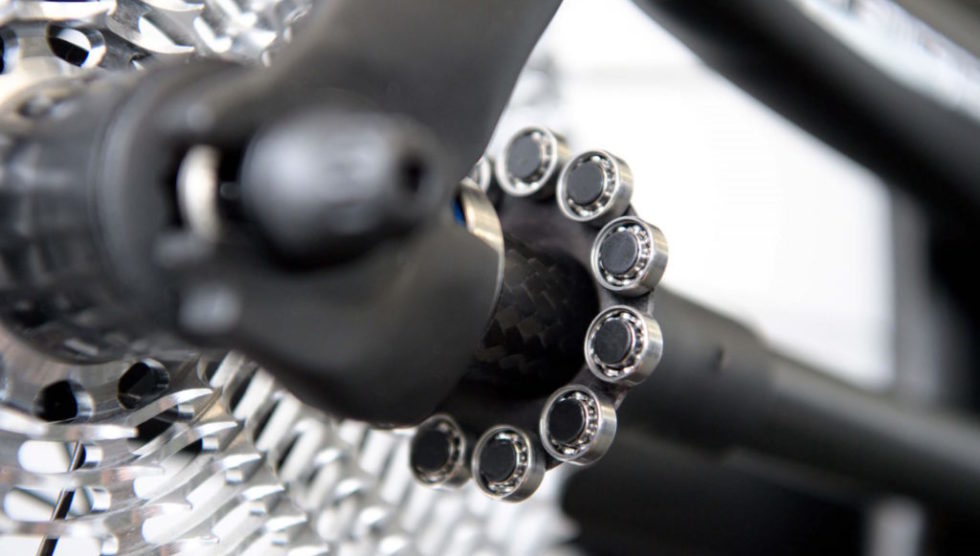 Die Kette haben die Ingenieure durch einen Antriebsschaft aus Karbon ersetzt. An beiden Enden befinden sich Kegel, die jeweils 21 Keramik-Kugellager aufnehmen können. Diese Kugellager greifen in die seitlich aufstehenden Zahnräder aus Karbon an Kurbel und Hinterrad. Durch diesen Kniff wandelt sich der Reibungswiderstand der Kette in die Gleitreibung der Kugellager, was die Effizienz des Antriebs deutlich steigert.