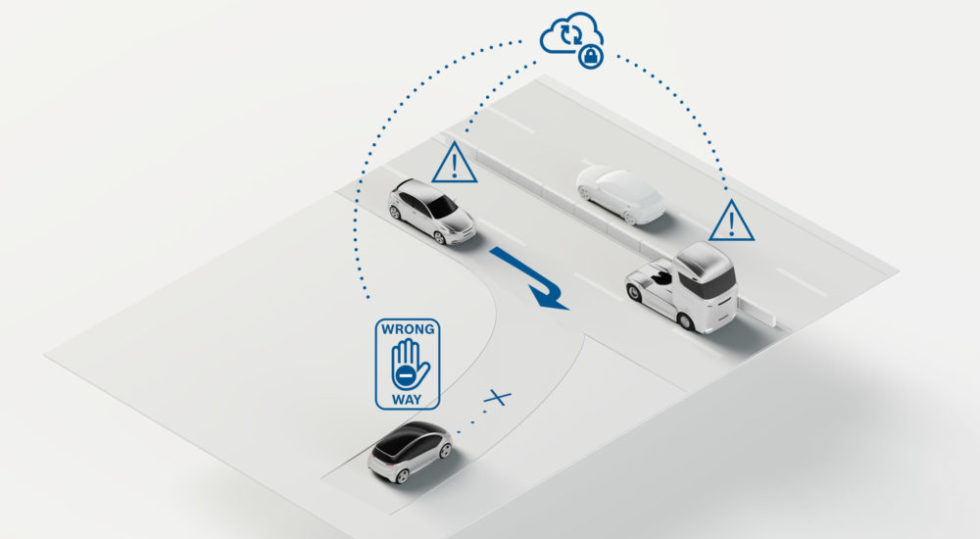 Das System erkennt, ob das Auto sich einer Autobahnauffahrt oder -abfahrt nähert. Diesen Standort sendet es als anonymisierte GPS-Position an eine Cloud. Im Backend der Cloud von Bosch findet nun ein Abgleich statt: Verglichen wird die aktuelle Bewegung des Fahrzeugs, also die Richtung, mit der erlaubten Fahrtrichtung. Stellt das System eine Abweichung fest, erscheint auf dem Display im Fahrzeug ein Warnhinweis und macht den Fahrer damit auf seine Falschfahrt aufmerksam. Da die Warnung innerhalb von Sekunden erfolgt, hat der Fahrer die Möglichkeit, seinen Fehler noch zu korrigieren, weil er sich noch nicht auf der Autobahn befindet. Zum Beispiel, indem er erst einmal anhält und sich orientiert.