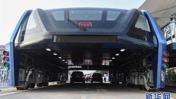 Der Riesenbus TEB aus China fährt einfach über dem Straßenverkehr hinweg. Der Entlastungseffekt auf den lokalen Straßenverkehr soll so stark sein, wie der Betrieb einer U-Bahn, die Baukosten sollen aber nur ein Fünftel einer U-Bahn betragen, weil kein Tunnel in die Erde gegraben werden muss.
