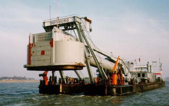 Gleichmäßig stochern sie weiter mit ihren stählernen Wünschelruten am trüben Rheingrund des Dormagener Hafens. Was sie dort unten tun, bleib allerdings nicht unbeobachtet. 10 m und zwei Decks höher hat Schiffsführer Thomas Bach per Monitor alles im Blick. Zugleich ist er der wichtigste Navigator. Denn da die Glocke selbst starr ist, muss er stets das ganze 52 m lange Schiff bewegen, damit seine Männer unten punktgenau das vorgegebene Raster abarbeiten können. Dazu giert er, wie es im Fachjargon heißt, den Spezialkahn an zwei Stahlseilen zehn bis 15 m hin und her. Er stellt ihn quasi etwas quer zur Strömung, um ihn dann in die gewünschte Position treiben zu lassen.
