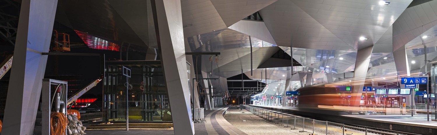 Das Dach, das sich über die fünf Bahnsteige mit insgesamt zehn Gleisen spannt, ist nicht die einzige architektonische Besonderheit. Zum Gesamtkonzept gehört auch die neue Konzernzentrale der Österreichischen Bundesbahnen (ÖBB), das sich ins Gesamtbild einfügt. Entworfen und gebaut hat es das Archtekturbüro Zechner & Zechner aus Wien.