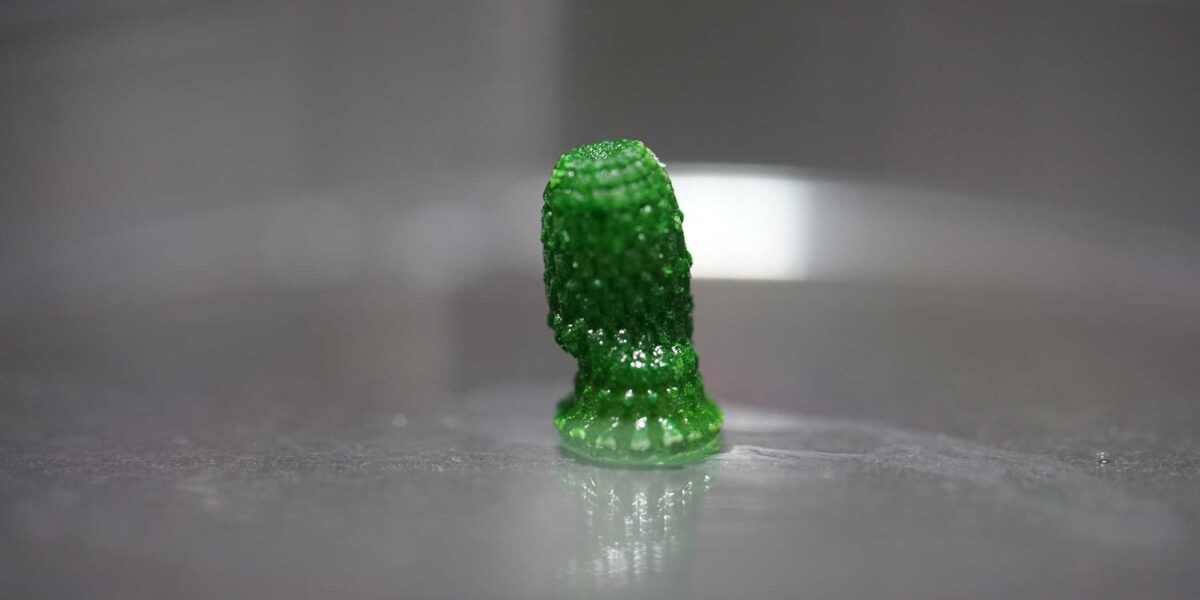 3D-gedruckte „Ananas“, in deren Innern Blaualgen wachsen, nach einer Entwicklungszeit von 60 Tagen. Die grüne Farbe stammt vom Chlorophyll der photosynthetischen Bakterien.