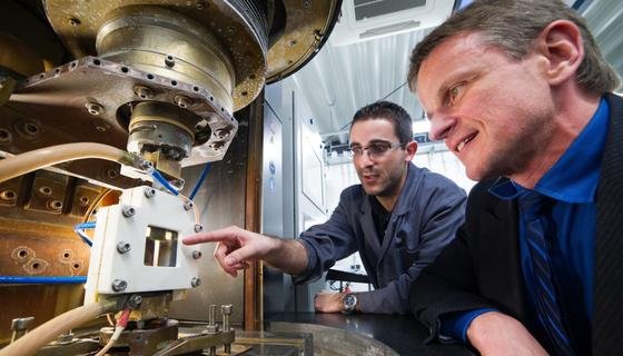 Prof. Dirk Bähre (r.) und Ingenieur Olivier Weber beobachten eine Probe beim elektrochemischen Abtragen.