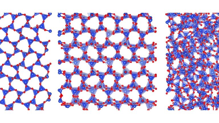 Zu den untersuchten Materialien gehören kristallines meteoritisches Tridymit (links), eine Tridymit-Phase mit kristalliner Bindungsordnung und amorpher Bindungsgeometrie (Mitte) sowie vollständig amorphes Silikatglas (rechts). Rot steht für Sauerstoff (O), Blau für Silizium (Si) und die üblichen SiO4-Tetraederanordnungen sind blau schattiert hervorgehoben.