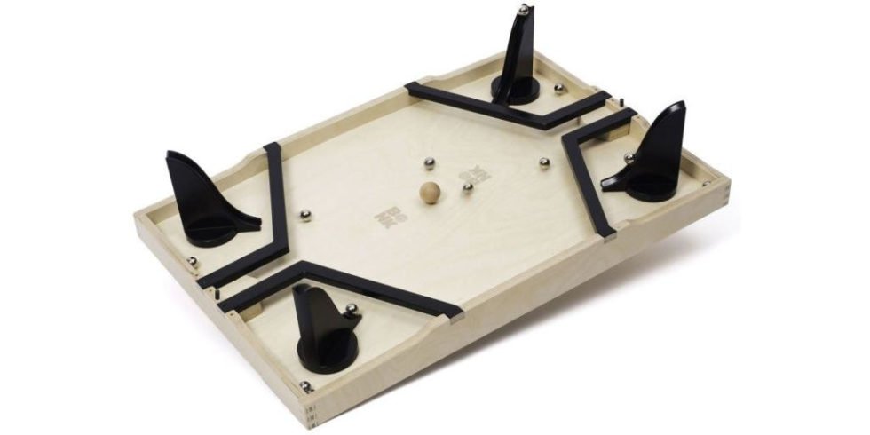 So still und besinnlich die Weihnachtszeit auch ist, hier lässt sich keine ruhige Kugel schieben. Bonk aus dem Hause Game Factory gilt als schnelles Geschicklichkeitsspiel für 2 oder 4 Spieler und ist bereits für 42,99 Euro zu haben. Auf dem Spielbrett befinden sich jeweils in den Ecken Abschussrampen für Edelstahlkugeln, welche auf dem Spielfeld eine Holzkugel treffen und ins gegnerische Tor befördern müssen. Die Rampen lassen sich in einem Aktionsbereich von 90° frei bewegen, sodass der geometrisch präzise berechnete Winkel mit Sicherheit zum Ziel führt – oder Glück.