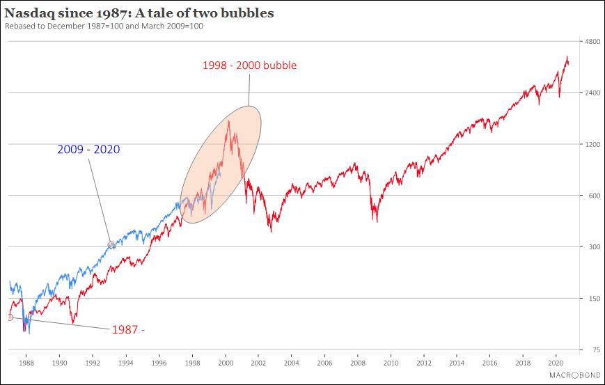 Tatsächlich gibt es Parallelen zu den Geschehnissen in den Jahren 1990 bis 2000: Damals wie heute wurde die weltweite Börsenrally von Firmen getrieben, die an der Tech-Börse NASDAQ gelistet waren. Und sowohl die damalige als auch die noch aktuelle Rally wurden – beziehungsweise werden – zu großen Teilen von Privatanlegern getragen. Handelt es sich aktuell also um eine Neuauflage einer alten Geschichte? Erleben wir gerade eine zweite Internet-Blase an der Börse? Droht bald der Absturz?