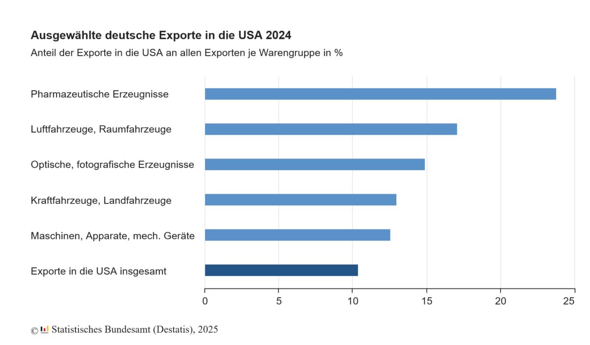 An der Spitze der Unternehmen mit dem höchsten US-Anteil an den Exporten steht die Pharmaindustrie. Beinahe jeder vierte Euro (23,8 %), der im Ausland verdient wird, entstammt dem Export in die USA. Einige Arzneimittelgruppen sind derzeit noch von US-Zöllen ausgenommen, etwa Insuline, Antibiotika und Impfstoffe. US-Präsident Trump hat aber mehrfach angekündigt, die Pharmaindustrie als ganzes nicht von den Einfuhrzöllen auszunehmen. Insgesamt haben die deutschen Pharmaexporte in die USA ein Volumen von 27,0 Mrd. €.