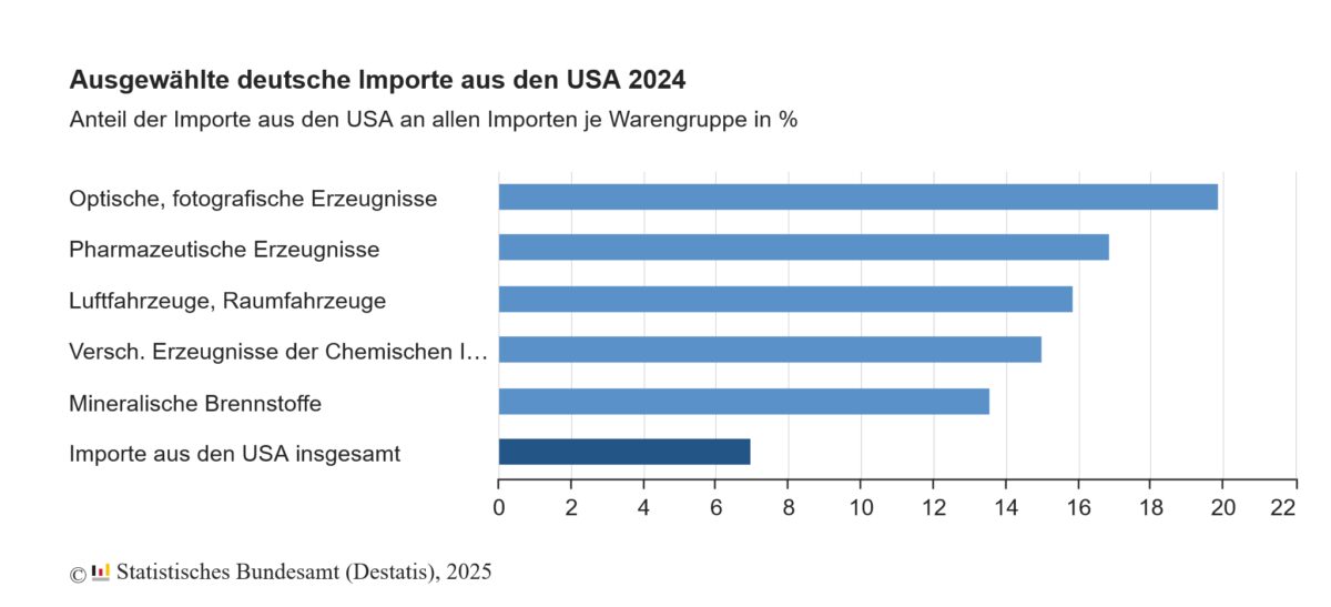 Als Importeur sind die USA für Deutschland nur für 7 % der Einfuhren verantwortlich. Der Nachbar Niederlande und China sind hier deutlich wichtigere Handelspartner. Dennoch stammen auch bei den Einfuhren viele pharmazeutische Erzeugnisse (16,9 % der deutschen Importe) von dort. Auch die Luft- und Raumfahrtindustrie ist eng mit US-Partnern verzahnt (15,9 % der Einfuhren).
