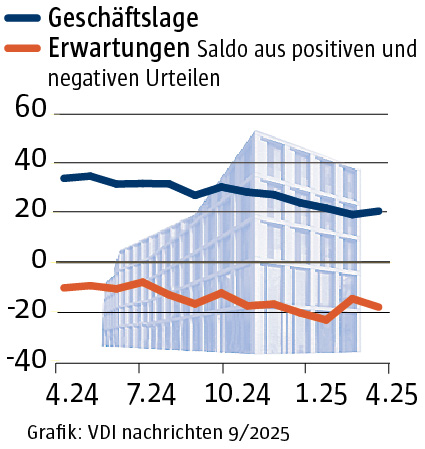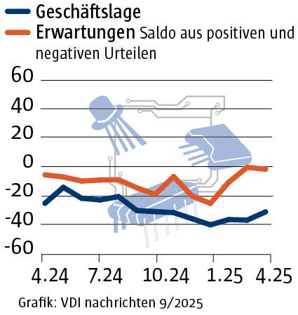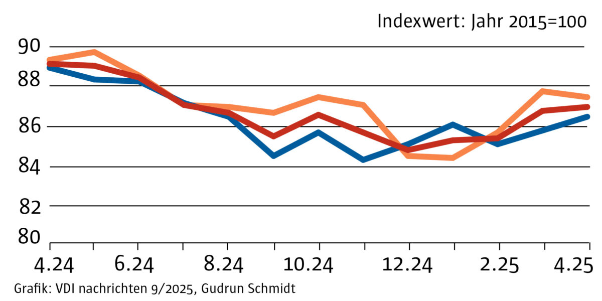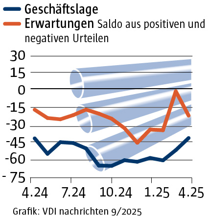 In der energieintensiven Branche Metallerzeugnisse war die Geschäftssituation sehr angespannt. Zwar meldeten die Firmen eine annähernd stabile Nachfrage, die Reichweite der Auftragsbestände hatte zuletzt zugenommen. Dies reichte jedoch nicht aus, um eine höhere Auslastung der Produktionsanlagen zu ermöglichen. Zu Beginn des zweiten Quartals wurden 73,0 % ermittelt, was deutliche 8,1 Prozentpunkte unter dem langfristigen Durchschnitt liegt. Die Sorgen hinsichtlich der künftigen Entwicklung nahmen jedoch ein gutes Stück ab, wenngleich immer noch ein Überhang an pessimistischen Meldungen zu erkennen war. Die restriktiven Personalpläne wurden zwar merklich nach oben revidiert, sahen aber immer noch an einigen Stellen Personalabbau vor.