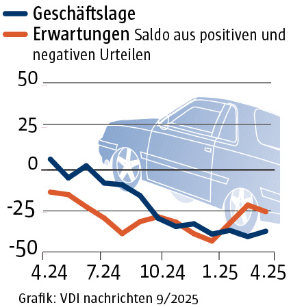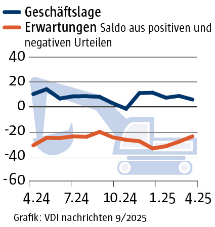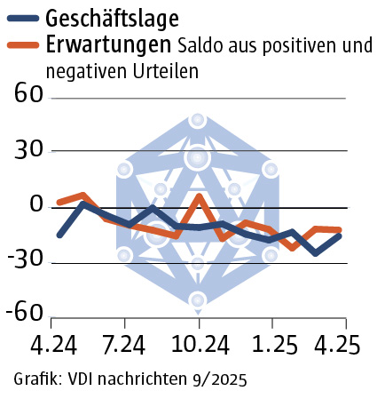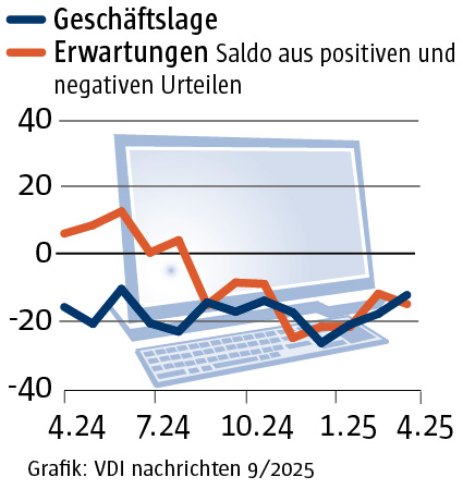 Im Maschinenbau war weiterhin ein raues Geschäftsklima zu beobachten. Viele Befragte meldeten eine schwache Geschäftslage. Die Nachfrageentwicklung war dabei weiterhin schwach. Die Unternehmen klagten über Lagerdruck und es bestand eine klare Unterauslastung. Zum Beginn des zweiten Quartals hatte der Auslastungsgrad 78,5 % betragen. Dies liegt zwar leicht über dem Wert im Vorquartal (78,1 % im Januar), aber auch deutliche 6,8 Prozentpunkte unter dem historischen Durchschnitt. Die Geschäftserwartungen für das kommende halbe Jahr klarten am aktuellen Rand etwas auf, blieben aber in Summe ungünstig. An manchen Stellen planten die Firmen Stellenabbau.