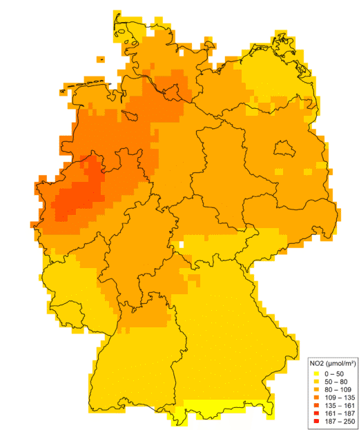 Wenn ich etwas Zeit hätte, könnte ich mich mit meinen Kolleginnen und Kollegen vom Deutschen Luft- und Raumfahrtzentrum zusammensetzen und und eine aktuelle Karte von Deutschland erstellen. Wir können genau sagen: „Okay, in diesem Jahr sind das die Hotspots, hier sind die Bereiche, in denen besonders viel Stickoxide produziert werden.“ Diese Daten sind über viele Jahre verfügbar.
